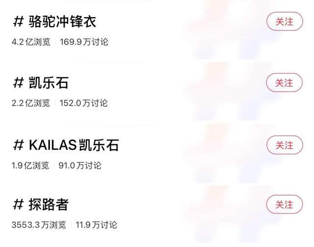 就品牌热度看,在小红书平台,骆驼冲锋衣相关笔记浏览量达4.2亿,凯乐石相关话题也超过4.1亿次,而探路者仅为3500万左右,差距悬殊。