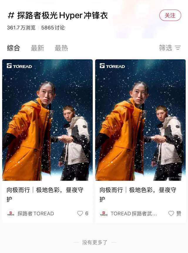 反观探路者,在公众认知中缺乏清晰的品牌标签。以探路者主推的新品“极光Hyper冲锋衣”为例,在小红书平台,其单条笔记点赞虽超8600,但相关话题下仅有两篇内容,总浏览量仅361.7万。
